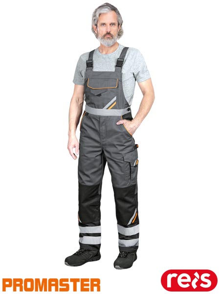 Spodnie ochronne ogrodniczki PROM, męskie.- tkanina: 65% poliester, 35% bawełna o gramaturze 290 g/m2- wstawki z żółtego i pomarańczowego materiału 80% poliester, 20% bawełna- zapinane na zamek błyskawiczny zasłonięty patką- podwójna kieszeń na klatce piersiowej zapinana na rzep- dwie kieszenie boczne, w tym jedna podwójna oraz dwie tylne zapinane na rzep- dwie kieszenie na nogawkach zapinane na rzep oraz dwie podłużne na narzędzia- kieszenie na wkładki nakolannikowe wkładane od dołu- możliwość regulacji długości za pomocą szelek, które dodatkowo mają w tylnej partii gumkę- gumka w pasie w tylnej partii oraz guziki umożliwiające lepsze dopasowanie- końcówka do przypięcia kluczy- pasy odblaskowe zwiększające widoczność- spełnia wymagania normy EN ISO 20471* (dotyczy pasów) oraz EN ISO 13688