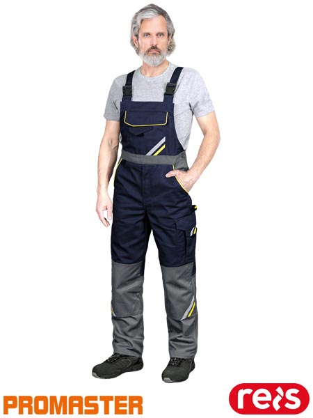 Spodnie ochronne ogrodniczki PROX.- tkanina: 65% poliester, 35% bawełna- gramatura 295-300 g/m2- wstawki z żółtego i pomarańczowego materiału 80% poliester, 20% bawełna- kieszeń na klatce piersiowej zapinana na rzep- dwie kieszenie po bokach- dwie kieszenie z tyłu zapinane na rzep- cztery kieszenie na nogawkach, w tym dwie zapinane na rzep- gumka w pasie w tylnej partii zwiększa swobodę ruchów oraz umożliwia lepsze dopasowanie- możliwość regulacji w pasie dzięki guzikom oraz długości za pomocą szelek- na kolanach kieszenie na wkładki nakolannikowe- końcówka do przypięcia kluczy- nowoczesny design dzięki- wstawki z elemementów odblaskowych- sprawdzona jakość, udoskonalony design