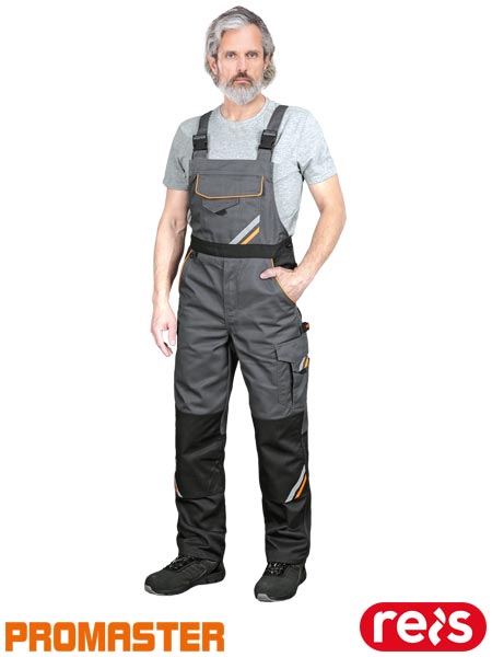 Spodnie ochronne ogrodniczki PROX.- tkanina: 65% poliester, 35% bawełna- gramatura 295-300 g/m2- wstawki z żółtego i pomarańczowego materiału 80% poliester, 20% bawełna- kieszeń na klatce piersiowej zapinana na rzep- dwie kieszenie po bokach- dwie kieszenie z tyłu zapinane na rzep- cztery kieszenie na nogawkach, w tym dwie zapinane na rzep- gumka w pasie w tylnej partii zwiększa swobodę ruchów oraz umożliwia lepsze dopasowanie- możliwość regulacji w pasie dzięki guzikom oraz długości za pomocą szelek- na kolanach kieszenie na wkładki nakolannikowe- końcówka do przypięcia kluczy- nowoczesny design dzięki- wstawki z elemementów odblaskowych- sprawdzona jakość, udoskonalony design