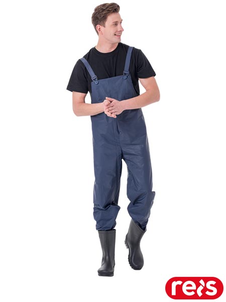 Spodnie ogrodniczki przeciwdeszczowe.- 65% PVC, 35% poliester- możliwość regulacji w długości szelkami, które w tylnej partii mają gumkę- możliwość regulacji w szerokości, dzięki napom znajdującym się w pasie z tyłu spodni- dodatkowe zapięcie u dołu spodni, dzięki czemu można zwęzić dół nogawek, by ograniczyć możliwość dostania się wody czy też wiatru