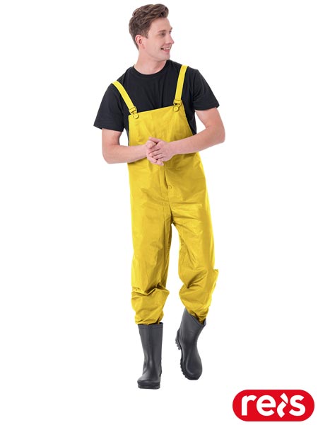 Spodnie ogrodniczki przeciwdeszczowe.- 65% PVC, 35% poliester- możliwość regulacji w długości szelkami, które w tylnej partii mają gumkę- możliwość regulacji w szerokości, dzięki napom znajdującym się w pasie z tyłu spodni- dodatkowe zapięcie u dołu spodni, dzięki czemu można zwęzić dół nogawek, by ograniczyć możliwość dostania się wody czy też wiatru