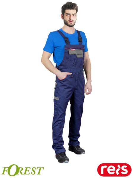 Spodnie ochronne ogrodniczki FOREST.- tkanina: 65% poliester, 35% bawełna- gramatura 290 g/m2- możliwość regulacji w pasie dzięki napom oraz w długości szelkami, które mają w tylnej partii dodatkowo gumkę- dziewięć kieszeni: dwie boczne, na nogawce jedna duża na napę i trzy małe, z tyłu dwie w tym jedna na napę oraz jedna na telefon komórkowy- dodatkowo dwie kieszenie w górnej partii spodni, w tym jedna na suwak