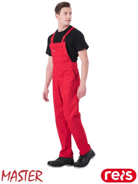 Spodnie ochronne ogrodniczki MASTER, męskie.- tkanina: 65% poliester, 35% bawełna- gramatura 240 g/m2- zapinane na guziki zasłonięte patką- kieszeń na klatce piersiowej zapinana na suwak z dodatkowymi przegródkami- dwie kieszenie boczne oraz jedna tylna- podłużna kieszeń na nogawce- możliwość regulacji długości za pomocą szelek, które dodatkowo mają w tylnej partii gumkę- gumka w pasie w tylnej partii oraz guziki umożliwiające lepsze dopasowanie- dodatkowa szlufka w pasie- uchwyt na młotek na lewej nogawce- fason: REGULAR