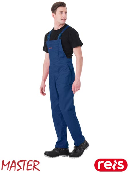 Spodnie ochronne ogrodniczki MASTER, męskie.- tkanina: 65% poliester, 35% bawełna- gramatura 240 g/m2- zapinane na guziki zasłonięte patką- kieszeń na klatce piersiowej zapinana na suwak z dodatkowymi przegródkami- dwie kieszenie boczne oraz jedna tylna- podłużna kieszeń na nogawce- możliwość regulacji długości za pomocą szelek, które dodatkowo mają w tylnej partii gumkę- gumka w pasie w tylnej partii oraz guziki umożliwiające lepsze dopasowanie- dodatkowa szlufka w pasie- uchwyt na młotek na lewej nogawce- fason: REGULAR