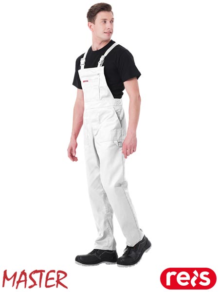 Spodnie ochronne ogrodniczki MASTER, męskie.- tkanina: 65% poliester, 35% bawełna- gramatura 240 g/m2- zapinane na guziki zasłonięte patką- kieszeń na klatce piersiowej zapinana na suwak z dodatkowymi przegródkami- dwie kieszenie boczne oraz jedna tylna- podłużna kieszeń na nogawce- możliwość regulacji długości za pomocą szelek, które dodatkowo mają w tylnej partii gumkę- gumka w pasie w tylnej partii oraz guziki umożliwiające lepsze dopasowanie- dodatkowa szlufka w pasie- uchwyt na młotek na lewej nogawce