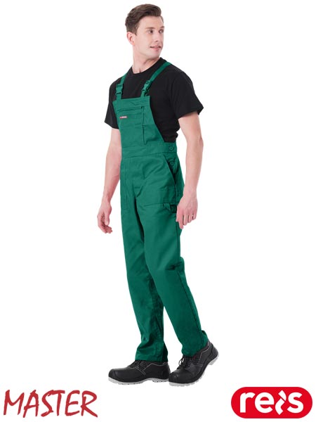 Spodnie ochronne ogrodniczki MASTER, męskie.- tkanina: 65% poliester, 35% bawełna- gramatura 240 g/m2- zapinane na guziki zasłonięte patką- kieszeń na klatce piersiowej zapinana na suwak z dodatkowymi przegródkami- dwie kieszenie boczne oraz jedna tylna- podłużna kieszeń na nogawce- możliwość regulacji długości za pomocą szelek, które dodatkowo mają w tylnej partii gumkę- gumka w pasie w tylnej partii oraz guziki umożliwiające lepsze dopasowanie- dodatkowa szlufka w pasie- uchwyt na młotek na lewej nogawce