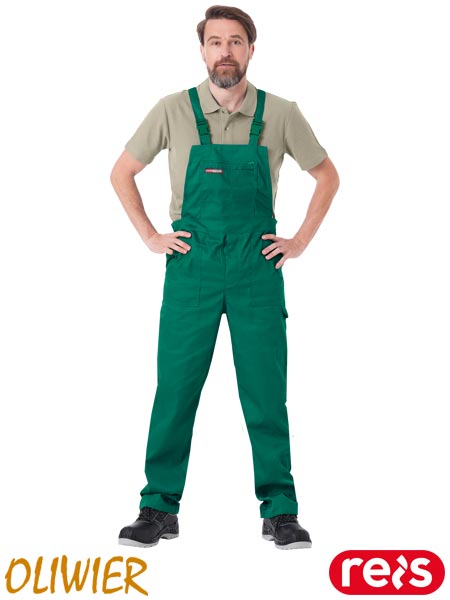 Spodnie ochronne ogrodniczki typu Oliwier.- tkanina: 65% poliester, 35% bawełna- gramatura 210-220 g/m2- możliwość regulacji w pasie dzięki dodatkowym guzikom oraz w długości szelkami, które to dodatkowo mają w tylnej partii gumkę- dwie boczne kieszenie oraz jedna na nogawce- dodatkowo dwie kieszenie w górnej partii spodni, w tym jedna na suwak