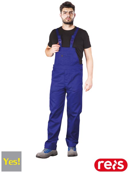 Spodnie ochronne ogrodniczki YES, męskie.- tkanina: 65% poliester, 35% bawełna- gramatura 250 g/m2- zapinane na guziki zasłonięte patką- kieszeń na klatce piersiowej z dodatkowymi przegródkami- dwie kieszenie boczne- podłużna kieszeń na prawej nogawce- możliwość regulacji długości za pomocą szelek- gumka w pasie w tylnej partii oraz guziki umożliwiające lepsze dopasowanie- fason: REGULAR