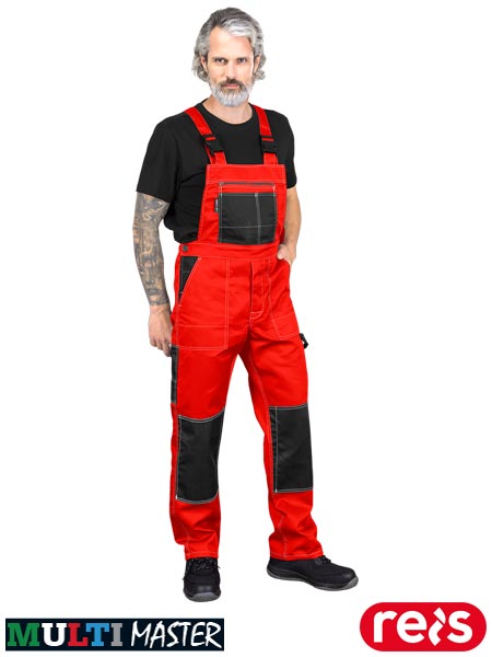 Spodnie ochronne ogrodniczki Multi Master, męskie.- tkanina: 65% poliester, 35% bawełna- gramatura 240 g/m2- zapinane na guziki zasłonięte patką- kieszeń na klatce piersiowej zapinana na suwak z dodatkowymi przegódkami- dwie kieszenie boczne- podłużna kieszeń na prawej nogwace- kieszenie na wkładki nakolannikowe wkładane od dołu- możliwość regulacji długości za pomocą szelek, które dodatkowo mają w tylnej partii gumkę- gumka w pasie w tylnej partii oraz guziki umożliwiające lepsze dopasowanie- uchwyt na młotek na lewej nogawce- fason: REGULAR