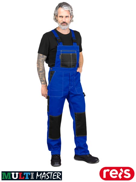 Spodnie ochronne ogrodniczki Multi Master, męskie.- tkanina: 65% poliester, 35% bawełna- gramatura 240 g/m2- zapinane na guziki zasłonięte patką- kieszeń na klatce piersiowej zapinana na suwak z dodatkowymi przegódkami- dwie kieszenie boczne- podłużna kieszeń na prawej nogwace- kieszenie na wkładki nakolannikowe wkładane od dołu- możliwość regulacji długości za pomocą szelek, które dodatkowo mają w tylnej partii gumkę- gumka w pasie w tylnej partii oraz guziki umożliwiające lepsze dopasowanie- uchwyt na młotek na lewej nogawce- fason: REGULAR