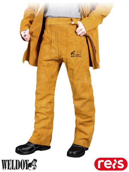 Spodnie spawalnicze skórzane.- skóra bydlęca dwoinowa- szyte trudnopalnymi i odpornymi na gorąco nićmi z kevlaru- wymiary: szer. ok. 106 cm, dł. ok. 105 cm- zapinane na rzep- cztery szlufki w pasie- zgodne z normą EN11611 (A1) oraz EN13688