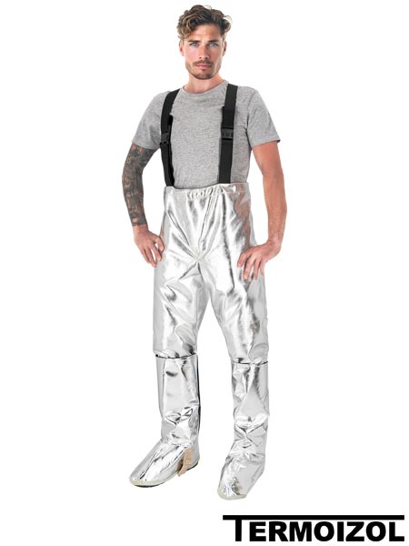 Spodnie ochronne żaroodporne.- wykonane z tkaniny para-aramid/preox metalizowanej- spodnie z rozporkiem na zakładkę, mocowane w pasie na zapinki dwudzielne- konstrukcja i wykonanie umożliwiają pracownikowi ich założenie bez konieczności ściągania obuwia- podtrzymywane są na szelkach wykonanych z taśmy niepalnej z możliwością regulacji długości za pomocą klamerek- chronią przed płomieniem, odpryskami płynnego metalu oraz intensywnym promieniowaniem cieplnym- przeznaczone do stosowania łącznie z ubraniem lub inną odzieżą ochronną do pracy przy spuście i rozlewaniu stali oraz metali kolorowych- polecane m.in. dla: odlewnika metali, hartownika, walcownika, wytapiacza- spodnie sprzedawane bez obuwia- zgodne z normami EN ISO 13688 oraz EN ISO 11612 (A1 B1 C3 D3 E3 F1)