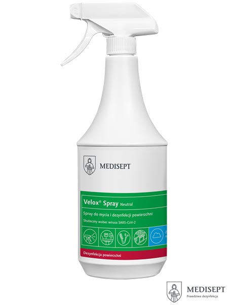 Spray do mycia i dezynfekcji powierzchni, Velox® Spray.- nie pozostawia smug i zacieków- działa już w 15 sek. na grzyby i 30 sek. na bakterie, prątki gruźlicy, wirusy (w tym Rota, Noro)- zarejestrowany jako wyrób medyczny i produkt biobójczy- gwarantuje wysoką redukcję ryzyka zakażenia- polecany do mycia i dezynfekcji małych powierzchni sprzętu medycznego: łóżek i foteli zabiegowych, aparatury medycznej i operacyjnej, sprzętu rehabilitacyjnego oraz wycisków stomatologicznych- uniwersalny - sprawdzi się do wszelkich powierzchni pozamedycznych np. w gastronomii, fryzjerstwie oraz do powierzchni mających kontakt z żywnością- dostępne rodzaje: U - neutralny, T - tea tonic- pojemność: 1 l, 5 l