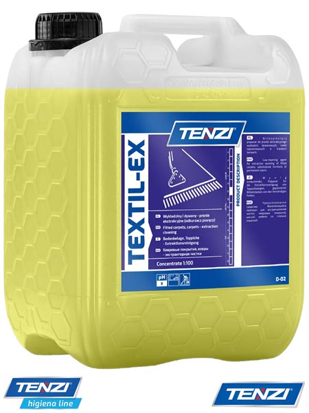 Skoncentrowany preparat do prania dywanów i wykładzin, TEXTIL-EX.- dokładnie penetruje każde włókno wykładziny- posiada przyjemny zapach- nie zawiera wybielaczy optycznych oraz rozpuszczalników- nie krystalizuje się- do czyszczenia metodą ekstrakcyjną (odkurzaczem piorącym)- polecany do prania każdego rodzaju powierzchni tekstylnych o trwałych barwach- zaleca się rozcieńczenie koncentratu w stosunku 100-400 ml/ 10 l wody ciepłej (letniej)- pojemność: 1 l, 5 l