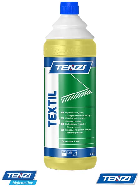 Skoncentrowany preparat pieniący do prania dywanów i wykładzin, TEXTIL.- dokładnie penetruje każde włókno wykładziny- posiada przyjemny zapach- nie zawiera wybielaczy optycznych oraz rozpuszczalników- tworzy pianę o strukturze krystalicznej- do czyszczenia szczotką (metodą szamponowania)- wymaga odessania i wypłukania bieżącą wodą (odkurzaczem piorącym)- polecany do prania i odświeżania każdego rodzaju powierzchni tekstylnych- zaleca się rozcieńczenie koncentratu w stosunku 100-400 ml/10 l wody ciepłej (letniej)- pojemność: 1 l, 5 l