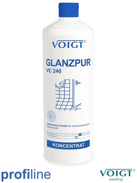 Alkoholowy środek do mycia powierzchni szkliwionych GLANZPUR VC240.- nadaje delikatny połysk- zabezpiecza powierzchnie przed niepożądanymi odciskami palców i dłoni- nie pozostawia osadów, smug i zacieków- przyjemny, orzeźwiający zapach- polecany do mycia powierzchni szkliwionych, w tym przedmiotów szklanych i porcelanowych, posadzek ceramicznych, płytek oraz przeszkleń- w zależności od stopnia zabrudzenia mytych powierzchni zaleca się stosować roztwór od 0,5 do 2% (od 50 do 200 ml środka na 10 l wody)- pH: 8-9- pojemność: 1 l