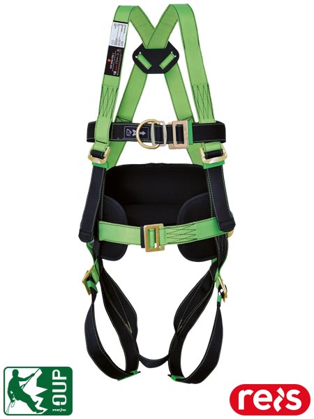 Szelki bezpieczeństwa z roboczym pasem pozycjonującym.- dwa pierścienie w kształcie litery D – piersiowy i grzbietowy wykonane ze stali o dużej wytrzymałości- dwa pierścienie w kształcie litery D, w obrębie pasa do pozycjonowania- regulowane pasy na ramionach, w obrębie ud i na klatce piersiowej- z roboczym pasem pozycjonującym- pasy do pozycji siedzącej- taśma szerokości 44±1 mm wykonana z poliestru- szycie wykonane białymi nićmi z poliamidu, odpornymi na rozciąganie- spełniają wymagania norm EN361 oraz EN358