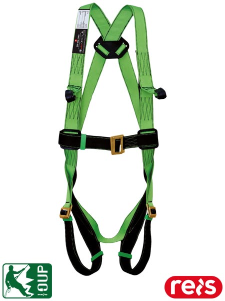 Szelki bezpieczeństwa.- jeden pierścień grzbietowy w kształcie litery D wykonany ze stali o dużej wytrzymałości- dwie przednie pętle tekstylne- regulowane pasy na klatce piersiowej oraz w obrębie ud- pasy do pozycji siedzącej- taśma szerokości 44 ±1 mm wykonana z poliestru- szycie wykonane czarnymi nićmi z poliamidu, odpornymi na rozciąganie- spełniają wymagania normy EN361