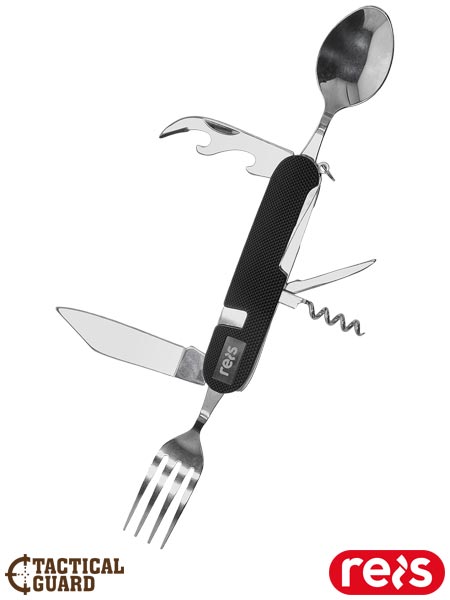 Sztućce turystyczne.- wykonane ze stali nierdzewnej- aluminiowa rękojeść o antypoślizgowej fakturze- w zestawie znajdują się: nóż, łyżka, widelec, otwieracz do butelek, otwieracz do puszek, rozwiertak/przebijak, korkociąg, brelok- składana konstrukcja umożliwia rozdzielenie na dwie części, co ułatwia korzystanie ze sztućców- przy pomocy breloka można je w łatwy sposób przypiąć do odzieży, plecaka- sprawdzą się podczas wypraw survivalowych, biwakowania, wycieczek, wędkowania, pikników