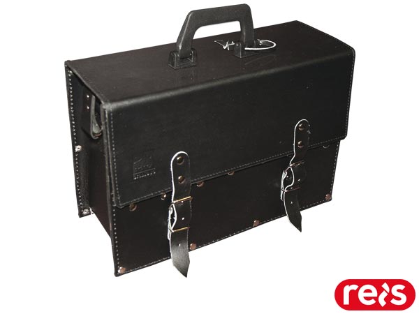Torba skórzana.- wykonana ze skóry licowej bydlęcej pokrytej z jednej strony powłoką poliuretanową- wymiary: szer. 39 cm, gł. 16 cm, wys. 27 cm- usztywniona tekturą- od wewnątrz wypodszewkowana skórą- zapinana na sprzączki- pas nośny skórzany z nad ramieniem z regulacją długości- wewnątrz uchwyt do mocowania narzędzi oraz kieszeń zapinana na zatrzask- w kolorze czarnym
