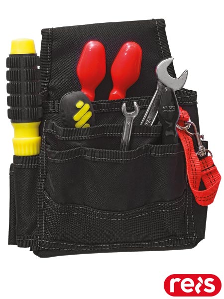Torba na narzędzia.- wykonana z poliestru 600D- dwie duże kieszenie oraz sześć mniejszych- trzy boczne kieszenie np. na śrubokręt- pasek z zapięciem dla przywieszenia rolki z taśmą czy kluczy- zakładana na pasek, dodatkowo metalowy uchwyt do zawieszenia- idealna dla monterów