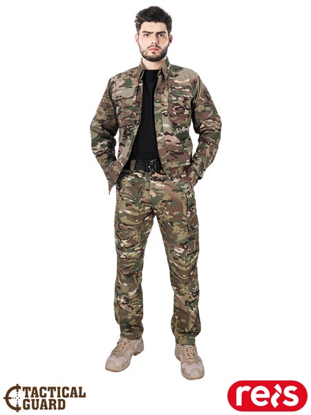 Ubranie ochronne Tactical Guard w skład którego wchodzi bluza i spodnie do pasa.- tkanina rip stop: 65% poliester, 35% bawełna- gramatura 210-220 g/m2- tkanina typu rip-stop - zabezpiecza przed rozdarciem w momencie zaczepienia o wystający przedmiot- bluza: zapinana na guziki; dwie kieszenie na klatce piersiowej zapinane na rzep; system wentylacji na plecach oraz pod pachami- spodnie do pasa: zapinane na napę i zamek błyskawiczny; możliwość regulacji w pasie dzięki gumce w bocznych partiach; liczne kieszenie m.in. dwie boczne, dwie z tyłu zapinane na rzep oraz kieszenie na nogawkach, w tym na telefon komórkowy; końcówka do przypięcia kluczy- dedykowane dla miłośników militariów, motocyklistów, motorowerzystów, podróżników, fanów paintballu- idealne dla firm ochroniarskich, leśników i rybaków- sprawdzi się podczas survivalu
