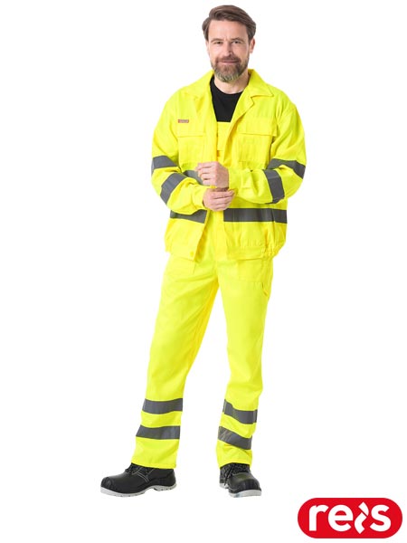 Ubranie ostrzegawcze składające się z bluzy i spodni ogrodniczek.- fluorescencyjna tkanina: 86% poliester, 14% bawełna- gramatura 300 g/m2- w dolnych partiach kurtki, rękawów i spodni znajdują się odblaskowe pasy, które zapewniają dobrą widoczność użytkownika- bluza: zapinana na guziki, na frontowej stronie dwie kieszenie zapinane na rzepę- na dole bluzy gumka ściągająca, zabezpieczająca przed wiatrem- spodnie: możliwość regulacji długości szelkami, w pasie dodatkowe guziki- dwie boczne kieszenie, jedna na nogawce, dodatkowo trzy kieszenie na górnej partii spodni oraz końcówka do przypięcia kluczy- idealne dla drogowców oraz służb porządkowych- spełnia wymogi normy EN ISO 20471 (klasa 3)