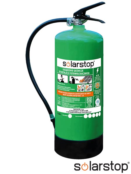 Urządzenie gaśnicze wodne do instalacji fotowoltaicznych 9 kg.- zawiera ekologiczną, innowacyjną wodną substancję gaśniczą- działa na zasadzie tłumienia pożaru poprzez chłodzenie i obniżanie temperatury materiału palnego- na powierzchni paneli fotowoltaicznych tworzy powłokę, która odizolowując dostęp światła, skutecznie obniża produkcję prądu elektrycznego do bezpiecznych wartości dla osoby gaszącej- zasięg strumienia pozwala na precyzyjne i efektywne skierowanie urządzenia w kierunku źródła pożaru, który w zależności od warunków atmosferycznych wynosi >11m, dzięki czemu może ono być obsługiwane z poziomu gruntu bez konieczności zbliżania się do pożaru