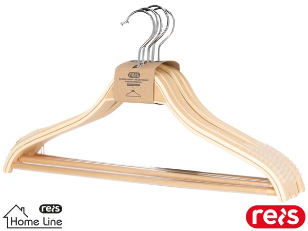 Wieszak.- drewniany z poprzeczką- chromowany uchwyt z żelaza- antypoślizgowe nakładki i nacięcia na ramionach- szerokość poprzeczki: 42 cm- do uniwersalnego użytku- gwarantuje bezpieczeństwo dla tkanin- zapewnia wentylację odzieży w garderobie- najmniejsza jednostka sprzedaży - 5 sztuk