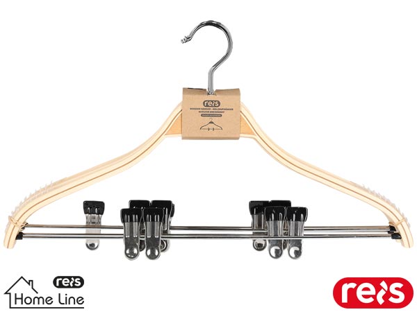 Wieszak.- drewniany z metalową poprzeczką wyposażoną w klipsy- chromowany uchwyt z żelaza- antypoślizgowe nakładki i nacięcia na ramionach- szerokość poprzeczki: 42 cm- do uniwersalnego użytku- gwarantuje bezpieczeństwo dla tkanin- zapewnia wentylację odzieży w garderobie- najmniejsza jednostka sprzedaży - 5 sztuk