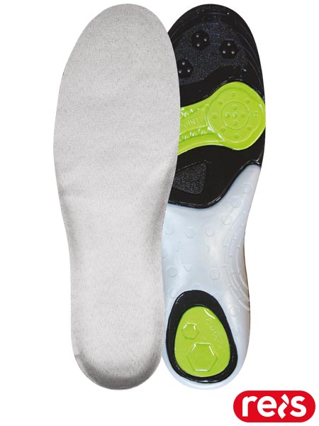 Wkładka do butów żelowa.- posiada welurową wyściółkę wierzchnią- spodnia warstwa jest połączeniem trzech żeli o różnej gęstości, które odciążają anatomiczne punkty podparcia stopy (pięta oraz I i V głowa kości śródstopia)- specjalne wyprofilowanie zapobiega płaskostopiu podłużnemu- zapewnia komfort pracy- amortyzuje wstrząsy- wkładka zalecana osobom aktywnym fizycznie