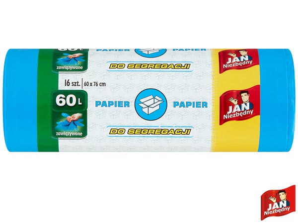 Worki na śmieci do segregacji.- worki posiadają łatwy i wygodny system zawiązywania Easy Pack- dostępne w czterech kolorach: Y – plastik, Z – szkło, N – papier, BR – odpady organiczne- pojemność: 35 l, 60 l, 120 l- ilość w opakowaniu: 35 l – 20 szt, 60 l – 16 szt, 120 l – 10 szt