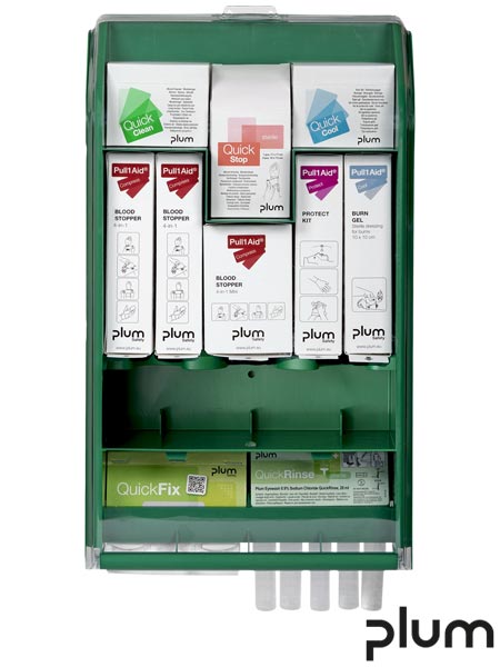 Stacja pierwszej pomocy Pull1Aid.- kompleksowy punkt dostępu do leczenia ran- stanowi szybką pomoc przy mniejszych i większych ranach- w zestawie znajduje się: higieniczna szafka apteczna z możliwością zawieszenia na ścianie, żel na oparzenia (18 saszetek), opatrunek na rany (3 sztuki), chusteczki do czyszczenia ran (20 saszetek), kompres o wymiarach 17 x 17cm (2 opakowania po 1 sztuce), kompres o wymiarach 7,5 x 12cm (3 sztuki), opatrunek żelowy na oparzenia o wymiarach 10 x 10cm (2 sztuki), zestaw do resuscytacji (maseczka z zaworkiem, rękawiczki jednorazowe, chusteczki do dezynfekcji dłoni, plastry (42 sztuki) oraz płyn do płukania oczu Eye Wash w jednorazowych ampułkach (5 sztuk po 20 ml)
