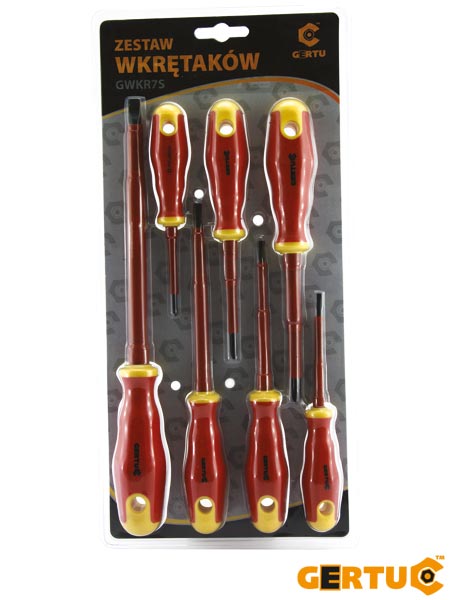 Zestaw wkrętaków.Zastosowano stal CR-V.HRC: 45-50.Rękojeść wykonana z PP+TPR.Zabezpieczenie przed porażeniem prądem 1000 V.Zestaw składa się z 7 elementów: SL8x175, SL5x125, SL4x100, SL3x75, PH0x60, PH1x80, PH2x100.
