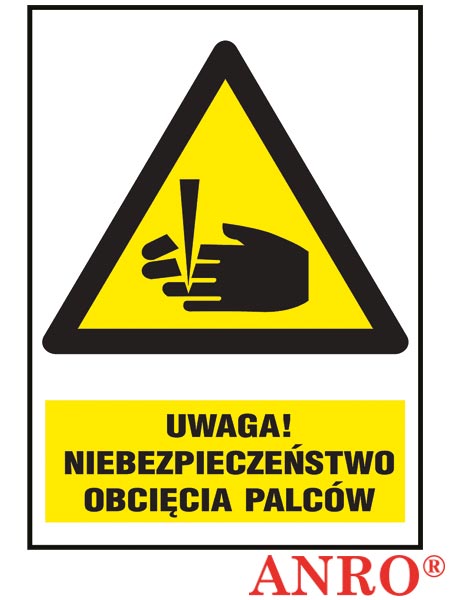 Znak BHP „Uwaga! Niebezpieczeństwo obcięcia palców”.- znak w rozmiarze 220x300- wykonany z: F - folia samoprzylepna, P - płyta PCV