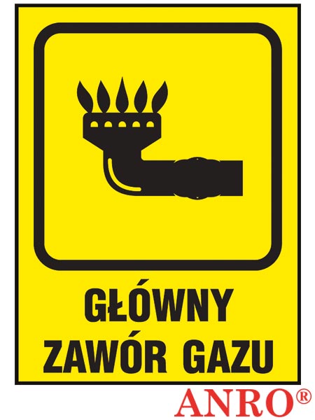 Znak uzupełniający - gaz „Główny zawór gazu”.- format znaku F1 w rozmiarze 150x205- wykonany z: F - folia samoprzylepna, P - płyta PCV