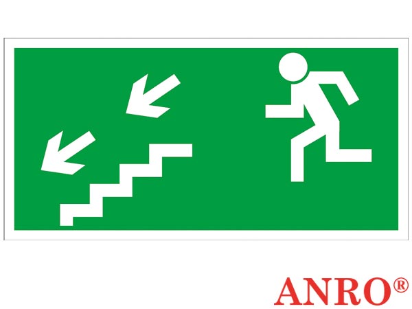 Znak ewakuacyjny „Kierunek do wyjścia drogi ewakuacji schodami w dół w lewo”.- format znaku A w rozmiarze 150x300- wykonany nadrukiem fotoluminescencyjnym: FS - folia samoprzylepna, PT - płyta PCV- posiada Świadectwo Dopuszczenia Centrum Naukowo-Badawczego Ochrony Przeciwpożarowej- zgodny z normą PN92/N-01256/02