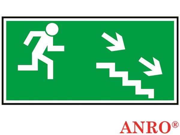 Znak ewakuacyjny „Kierunek do wyjścia drogi ewakuacji schodami w dół w prawo”.- format znaku A w rozmiarze 150x300- wykonany nadrukiem fotoluminescencyjnym: FS - folia samoprzylepna, PT - płyta PCV- posiada Świadectwo Dopuszczenia Centrum Naukowo-Badawczego Ochrony Przeciwpożarowej- zgodny z normą PN92/N-01256/02
