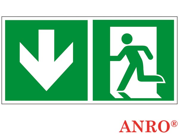 Znak ewakuacyjny „Kierunek do wyjścia w dół (za drzwiami) w lewo”- format znaku A w rozmiarze 150x300- wykonany nadrukiem fotoluminescencyjnym: FS - folia samoprzylepna, PT - płyta PCV, PS - płyta foto samoprzylepna- zgodny z normą EN ISO 7010