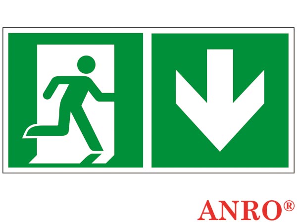 Znak ewakuacyjny „Kierunek do wyjścia w dół (za drzwiami) w prawo”- format znaku A w rozmiarze 150x300- wykonany nadrukiem fotoluminescencyjnym: FS - folia samoprzylepna, PT - płyta PCV- zgodny z normą EN ISO 7010