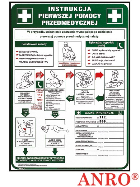 Instrukcja BHP „Instrukcja pierwszej pomocy przedmedycznej”.- format znaku L w rozmiarze 250x350- wykonany z płyty PCV